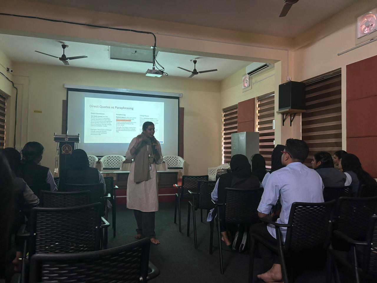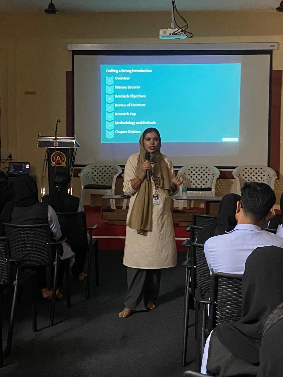 The programme began with an introduction to the fundamentals of research, including topic selection, framing research questions, and understanding research ethics. Ms. Shibila A elaborated on the structure of a dissertation, covering key chapters such as introduction, literature review, methodology, analysis, and conclusion. She also provided practical tips on citation styles, academic writing techniques, and the use of reliable sources.