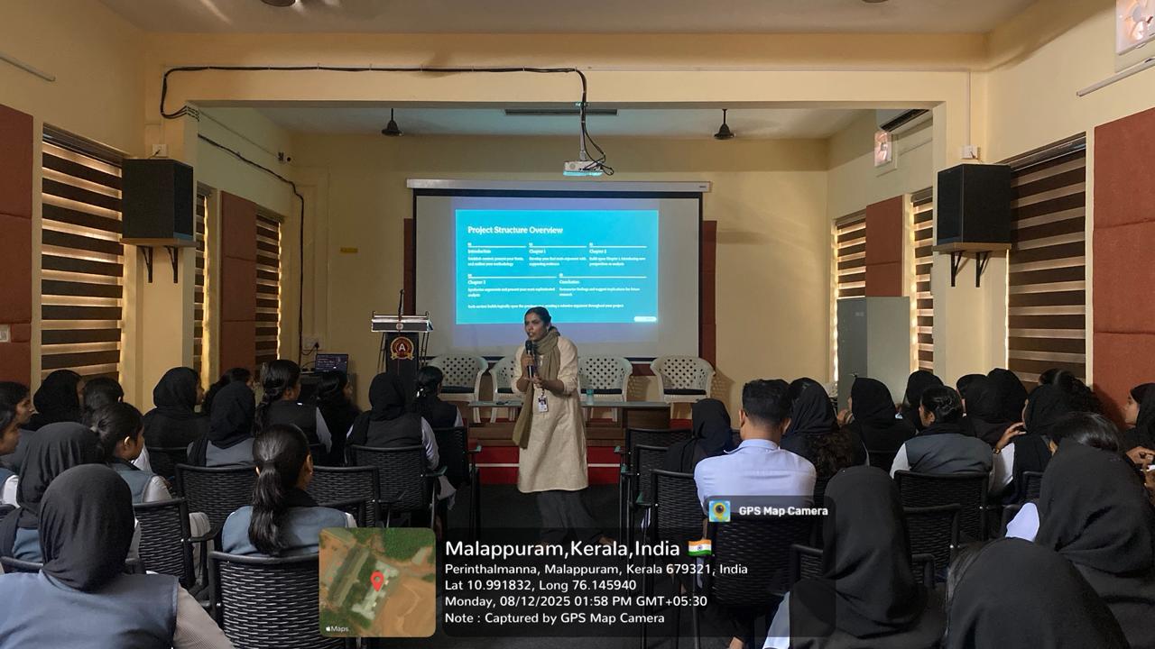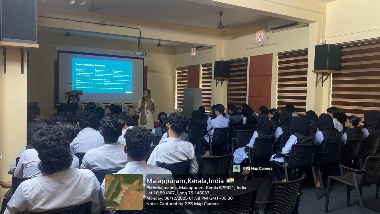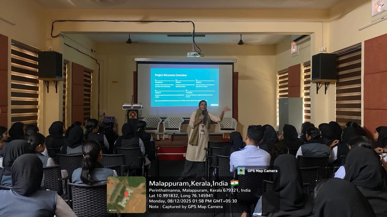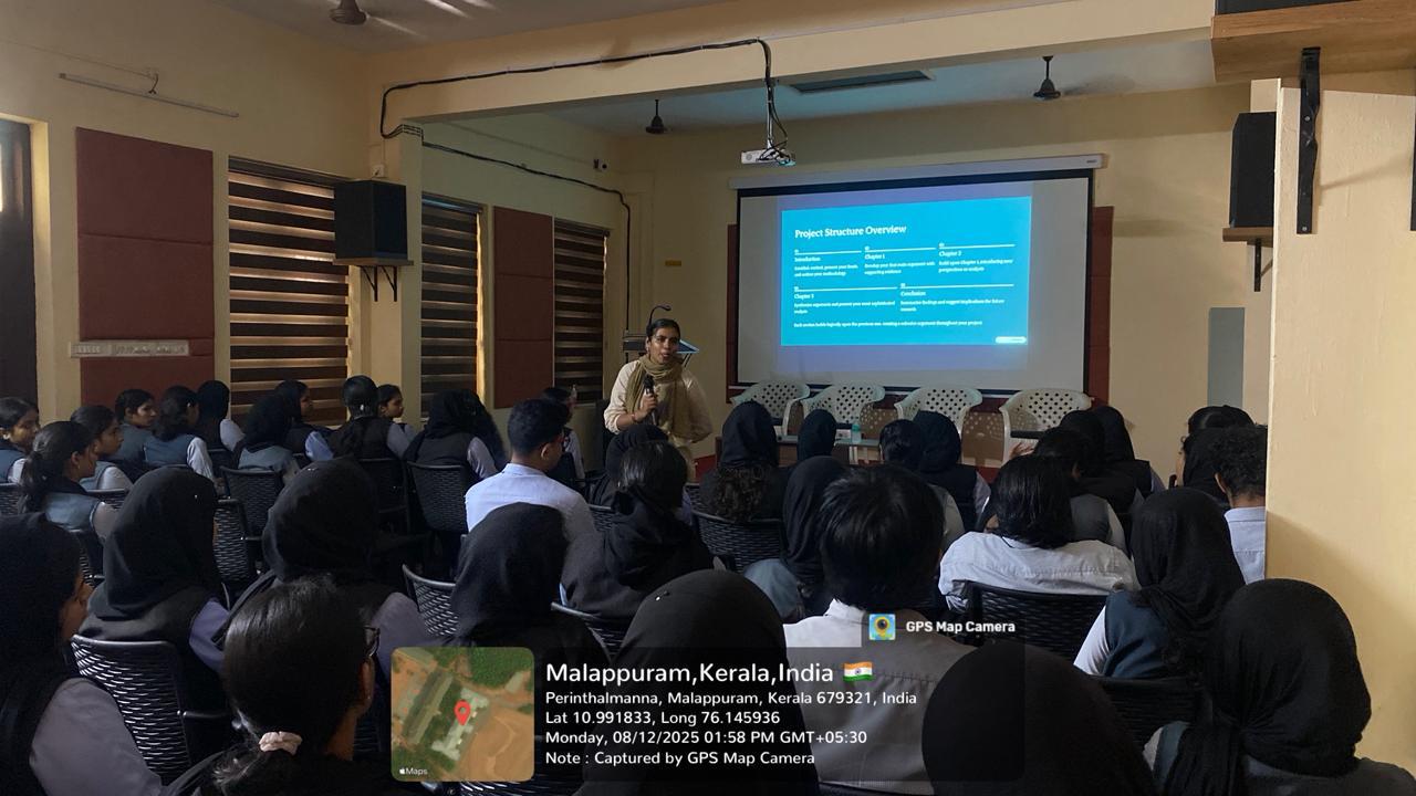 The PG Department of English conducted a "Project/Dissertation Workshop" on 8th December 2025 at MP Narayana Menon Hall with the objective of guiding 3rd year graduate and postgraduate students in the essential components of academic research. The session was led by Ms. Shibila A, Research scholar, JRF at PG and Research department of English Govt. Victoria college, Palakkad and also assistant professor of Gems Arts and Science college Ramapuram. The resource person, whose expertise greatly contributed to the effectiveness of the workshop.