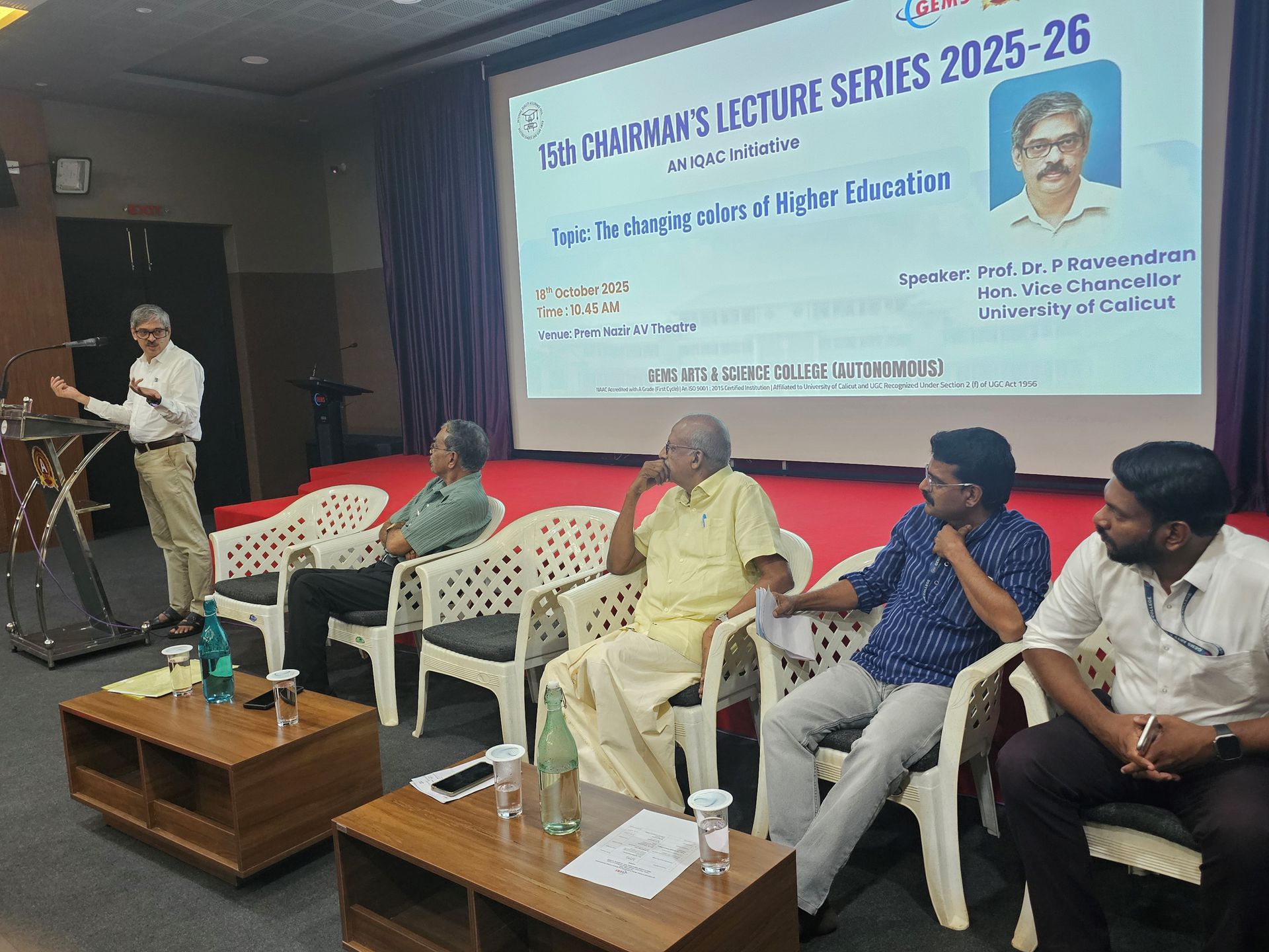 by Dr. Finose, Director, IQAC, GEMS Arts and Science College. The brief speech about the institution was given by Shri M Vasudevan, Vice Chairman . The Academic and Research Director, Dr. BG Unni spoke in brief about the origin of the chairman’s lecture series, and its importance to participants. He introduced briefly about the distinguished chief guest of the day, Prof. Dr. P. Raveendran, Vice Chairman, University of Calicut. delivered the speech on the topic “The changing colors in Higher Education. He began the session by pointing out the current system followed in primary education, and the