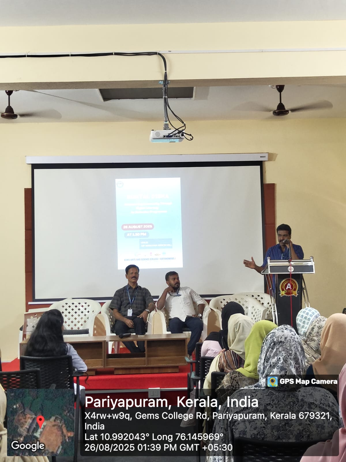 The Department of Management Studies, GEMS Arts and Science College (Autonomous), organized an extension programme titled “DIGITAL DISHA – Empowering Community Through Digital Literacy” on 26th August 2025, from 1:30 PM to 3:00 PM at the M.P. Narayana Menon Hall. The programme aimed to promote digital awareness and strengthen the technological skills of community members from Ramapuram and Mankada Panchayats.