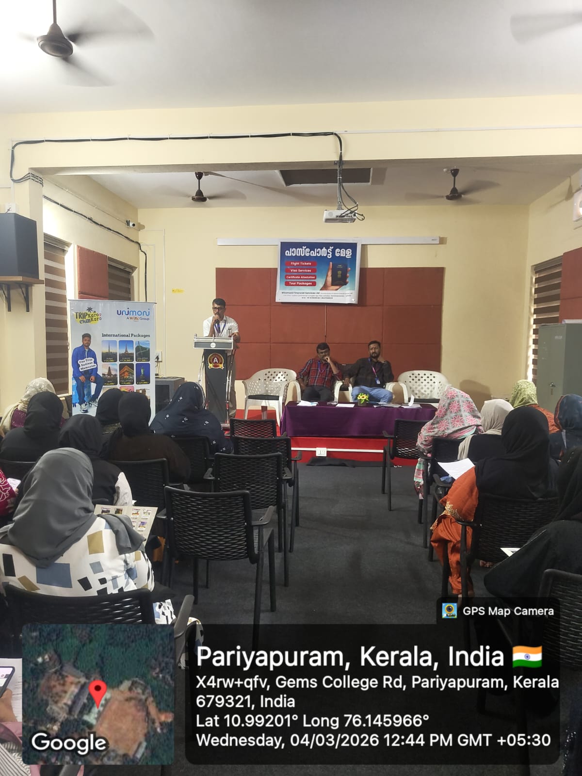The Department of Management Studies organized an extension activity titled “Passport Mela – From Campus to the World” on 03 March 2026 at M.P Narayana Menon Hall from 10.30 AM to 1.30 PM. The programme was conducted in association with Unimoni Financial Services Ltd (Wizzimoni Financial Services Ltd), Perinthalmanna for the students of our college and students of Sreenarayana Guru Open University (SGOU), Ramapuram and Mankada.