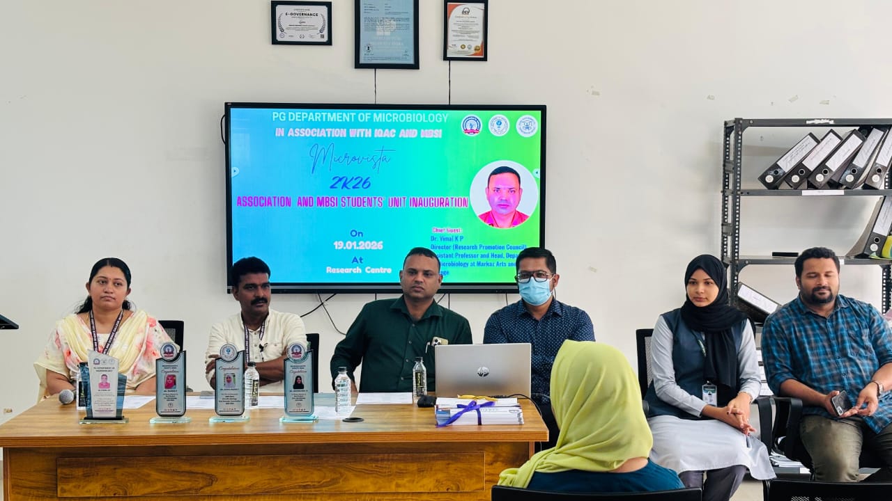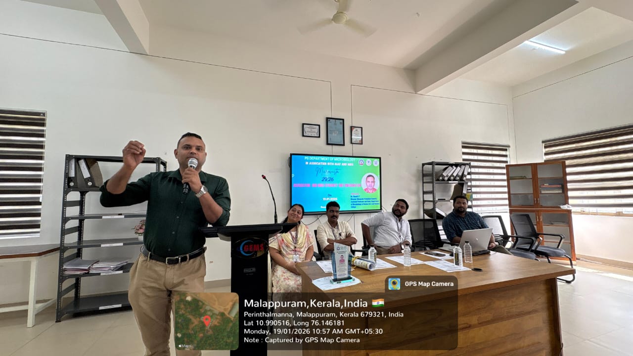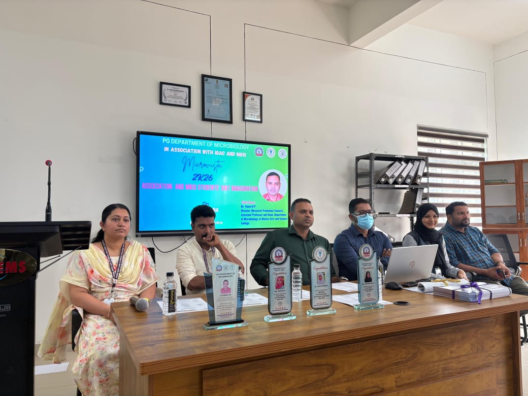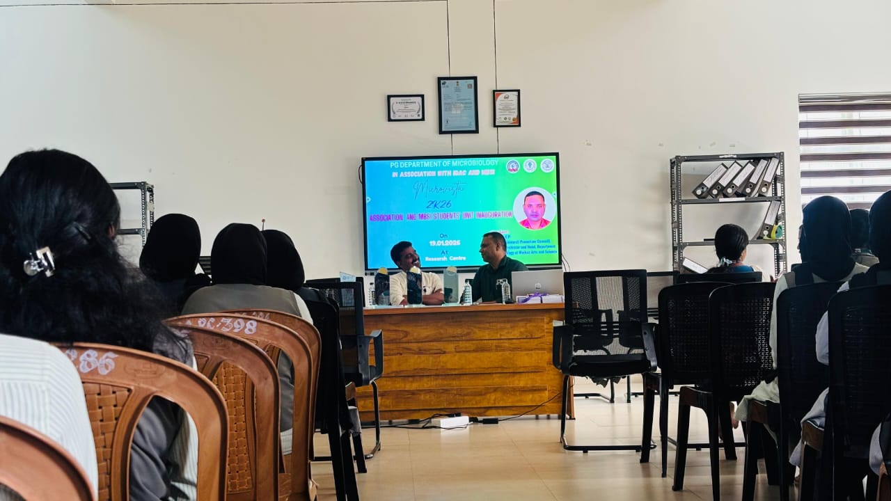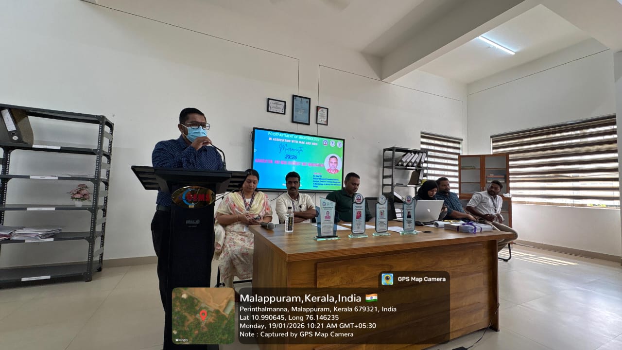 The event began with a prayer by Ms. Salma Fidha OM, followed by the welcome address by Ms. Resna N K, Assistant Professor and Head, PG Department of Microbiology. The Presidential Address was delivered by Dr. Naveen Mohan, Principal, GEMS ASC, highlighting the role of student associations in holistic growth.