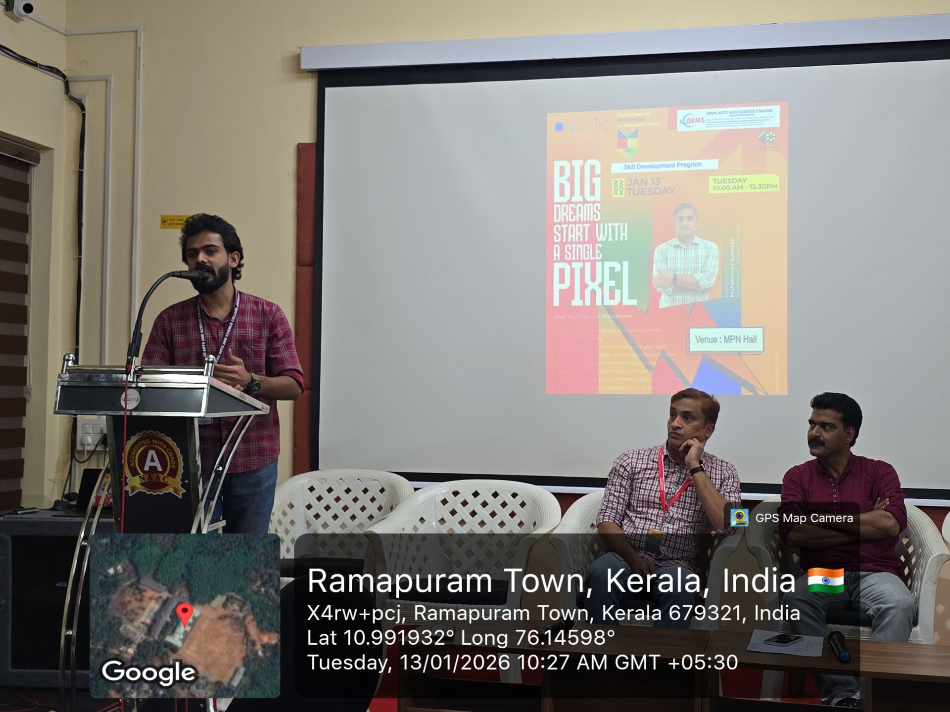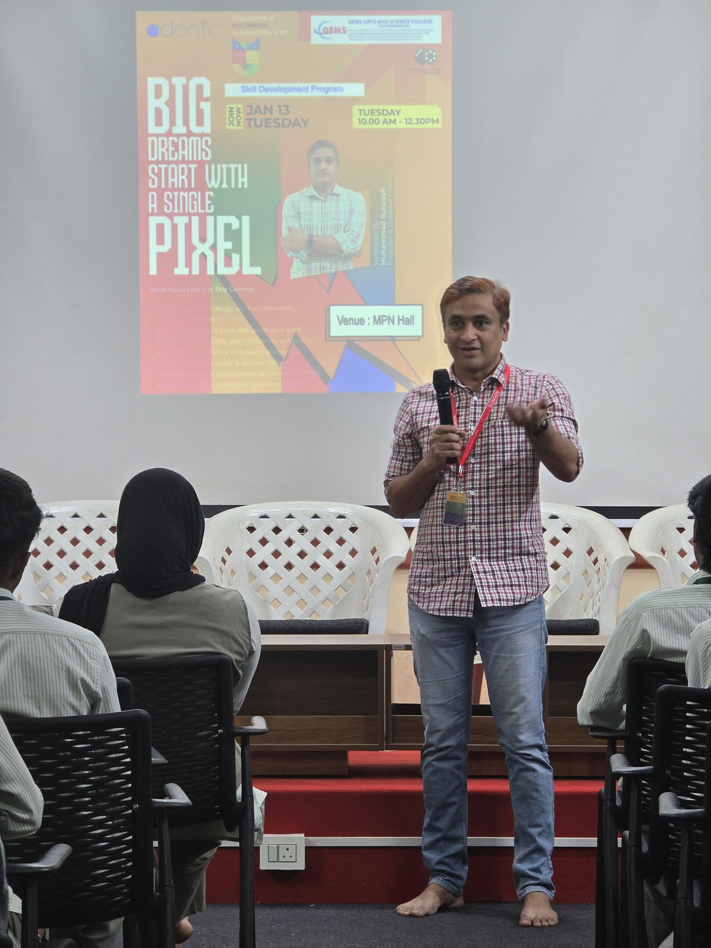 The Department of Multimedia, in association with Adontic Technologies and Adontic School, organized a Skill Development Program titled “Big Dreams Start with a Single Pixel” on 13th January 2025 at the MPN Hall. The program was conducted with the objective of equipping students with industry-oriented knowledge and professional skills required in the field of graphic design and multimedia.