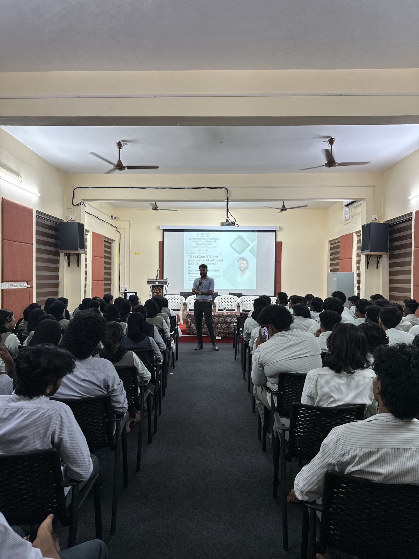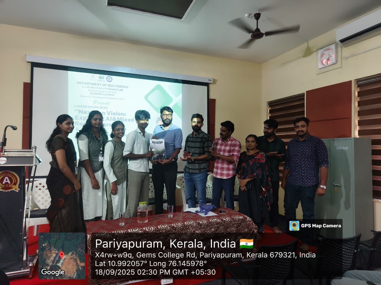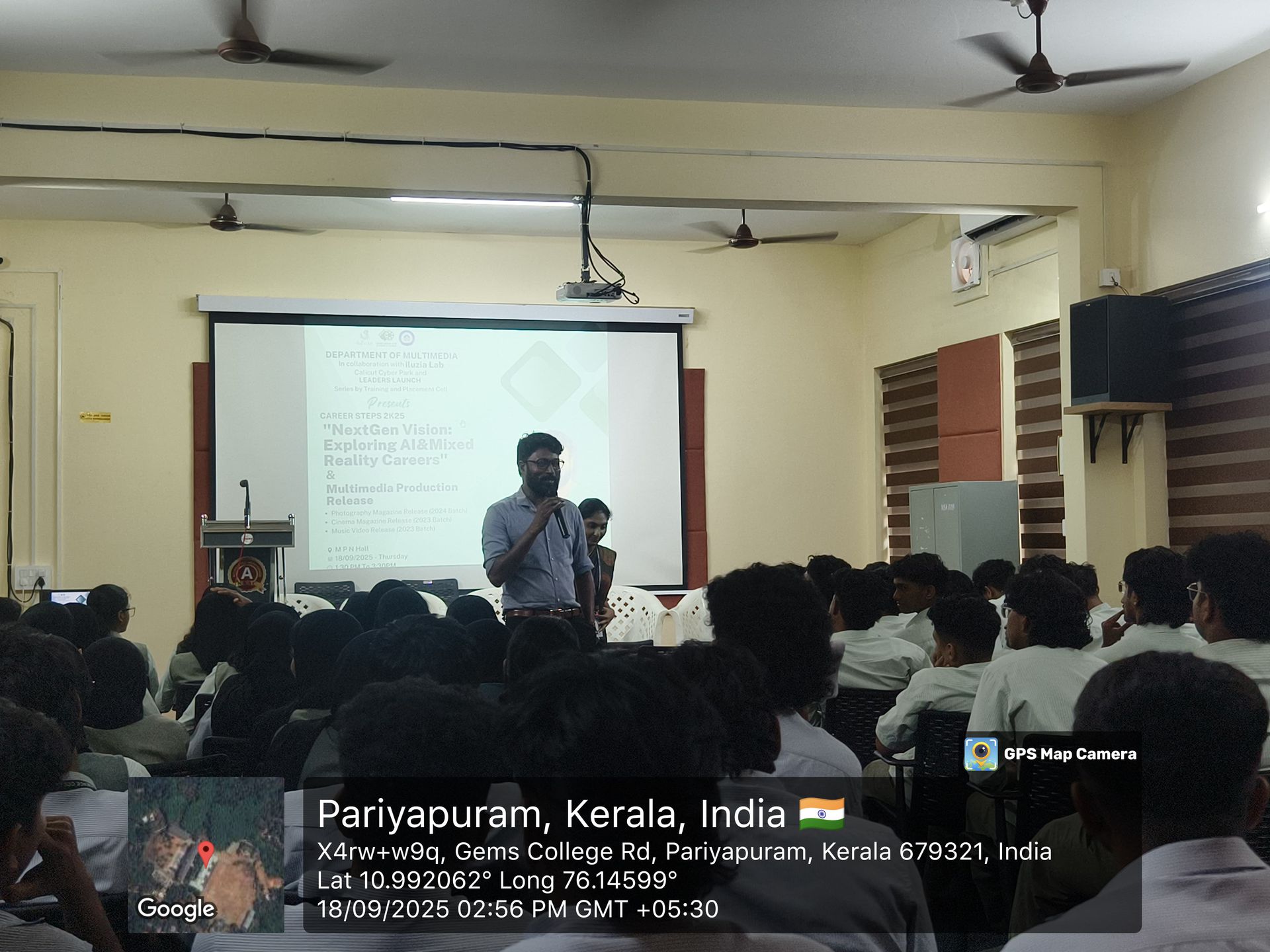 The Department of Multimedia, GEMS Arts and Science College (Autonomous), in collaboration with Iluzia Lab, Calicut Cyber Park, and Leaders Launch under the Training and Placement Cell, organized an academic program titled Career Steps 2K25: “NextGen Vision – Exploring AI & Mixed Reality Careers” on 18th September 2025 at M.P.N Hall.