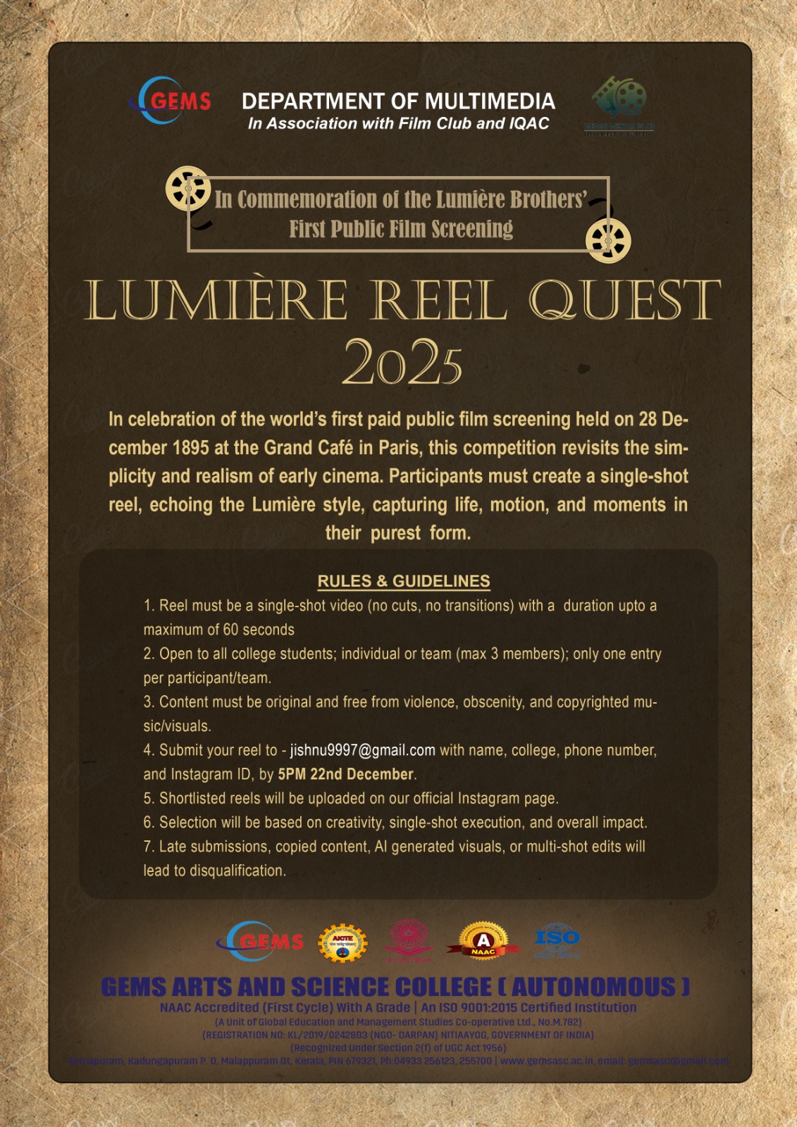 The Department of Multimedia, in association with the Film Club – GEMS Arts & Science College (Autonomous), organized an Inter-Collegiate Single-Shot Reel Making Competition titled “Lumière Reel Quest” in commemoration of the world’s first commercial film screening by the Lumière Brothers at the Grand Café, Paris, on 28 December 1895.