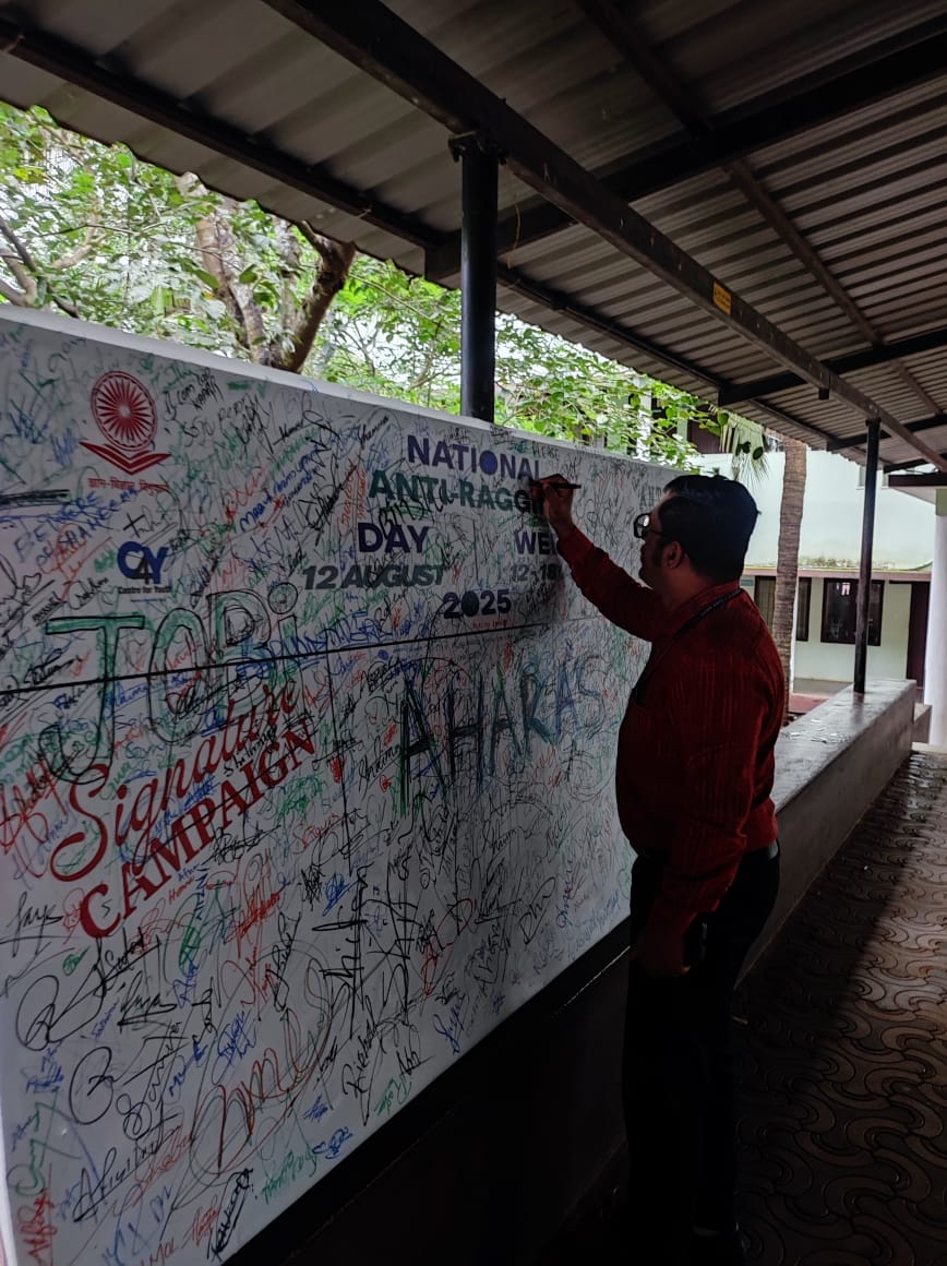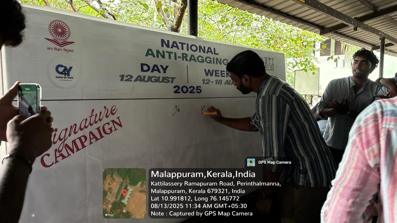 The program was also graced by IQAC Coordinator Dr. Finose, Vice Principal Dr. Abdusamad, faculty members, and the Anti-Ragging Squad. All dignitaries took part in the photo session, encouraging students to join the campaign in solidarity against ragging. The Photo/Selfie Corner was designed with the directions of UGC. Students were invited to take selfies and group photos, which they later shared on social media platforms with designated hashtags to spread awareness beyond the campus. The event saw enthusiastic participation from students across all departments, who appreciated the fresh and interactive approach. It served as a platform to not only express their support for a ragging-free campus but also strengthen bonds with peers in a positive, inclusive environment. The Photo/Selfie Corner initiative successfully combined awareness with creativity, reinforcing the campaign’s core message in a memorable way. The event concluded with a vote of thanks to all participants, staff, and student volunteers for making the campaign a vibrant success.