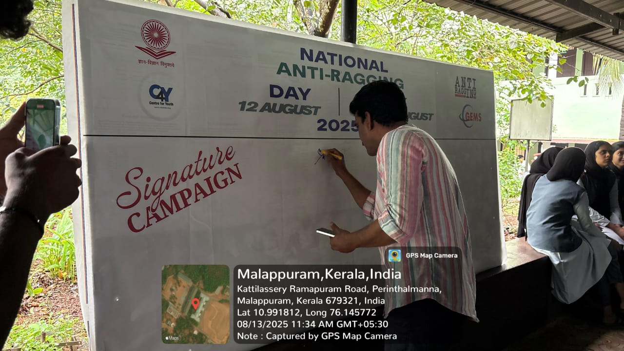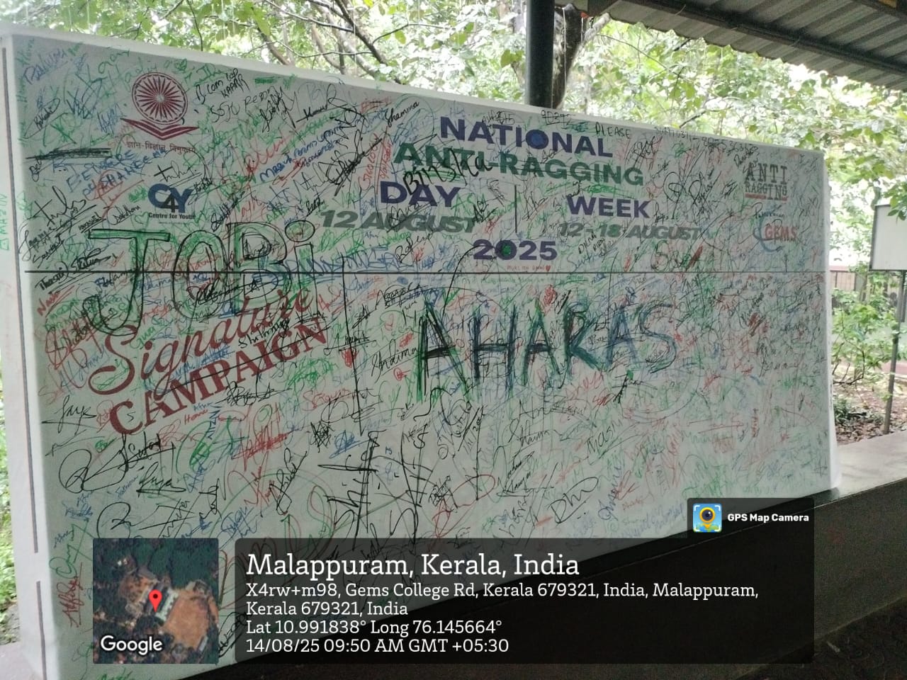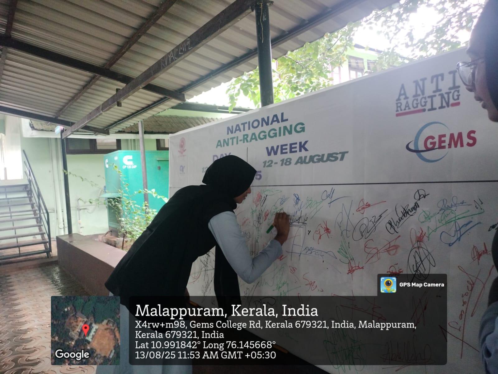 As part of the Anti-Ragging Week celebrations, a creative and engaging Photo/Selfie Corner was set up on 14th August 2025 at Gems Arts and Science College. This initiative aimed to raise awareness about the importance of a ragging-free campus through a fun, student-friendly medium.The event was inaugurated by the Principal, Dr. Naveen Mohan, who addressed the gathering and emphasized the need for continuous efforts to create a safe, respectful, and inclusive college environment. He appreciated the innovative approach taken by the organizing team to spread the message of anti-ragging.
