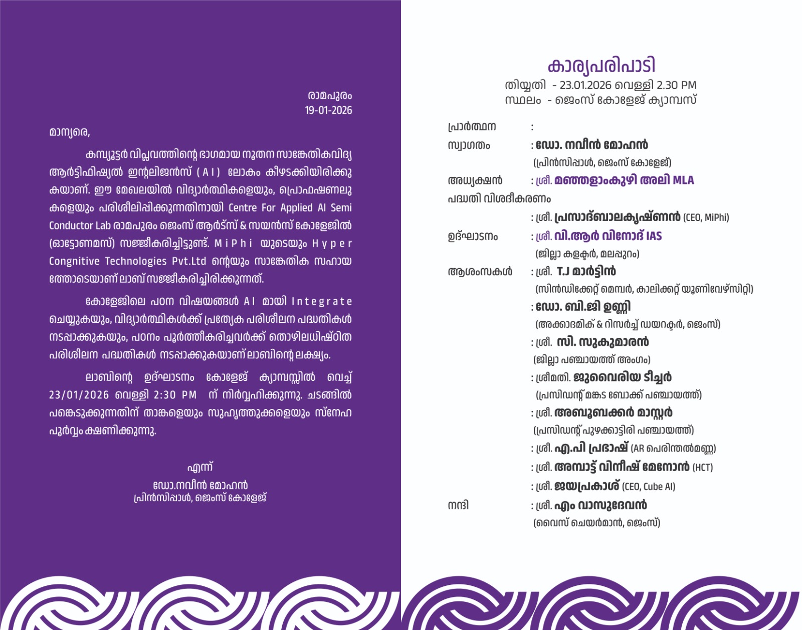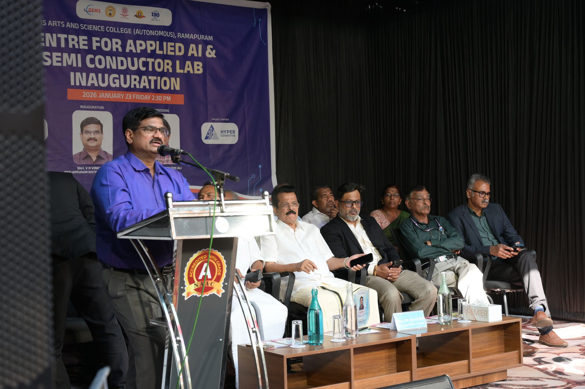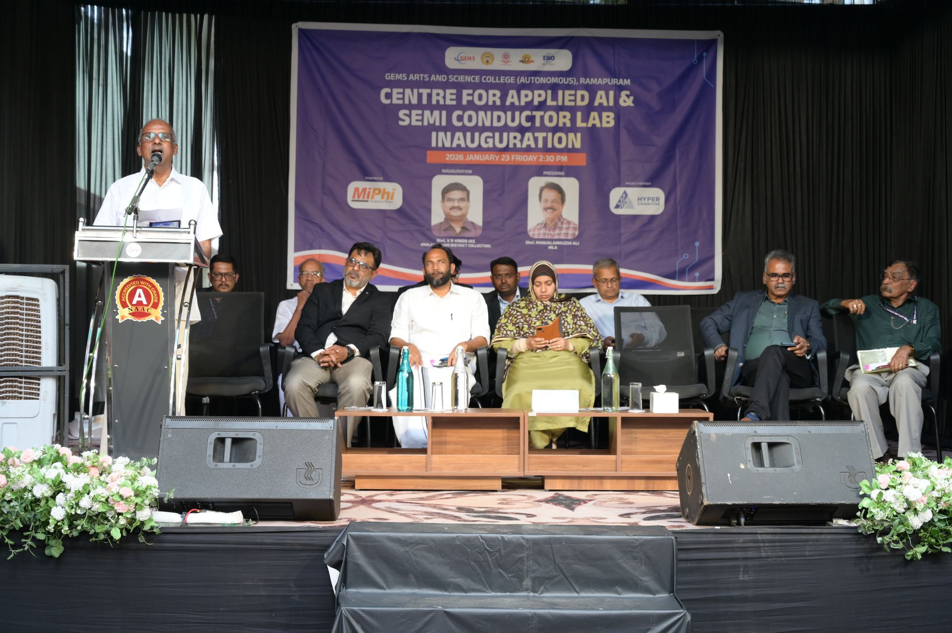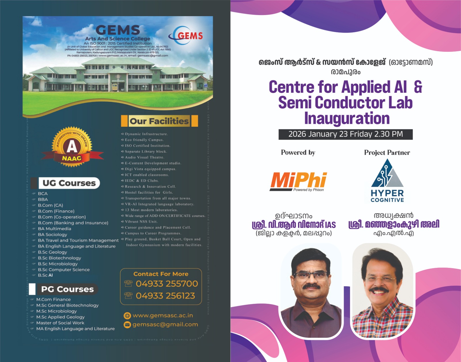 GEMS Arts and Science College (Autonomous), Ramapuram, is hosting the inauguration of the Centre for Applied AI & Semi Conductor Lab on Friday, January 23, 2026, at 2:30 PM. The event will be inaugurated by Shri. V R Vinod IAS, the Malappuram District Collector, and presided over by Shri. Manjalamkuzhi Ali MLA. This initiative is powered by MiPhi (Powered by Phison) in collaboration with project partner Hyper Cognitive.