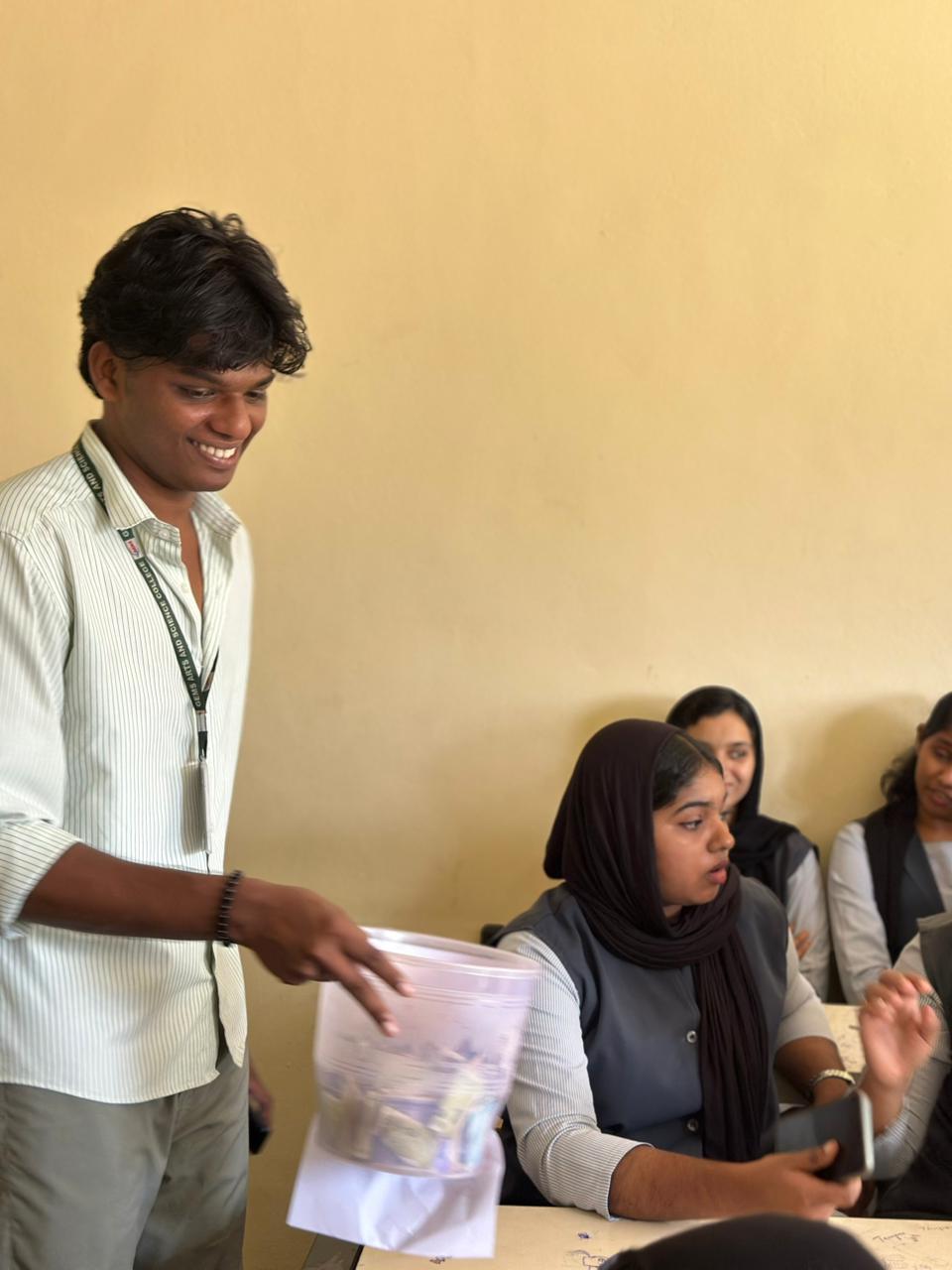 The afternoon began with the gathering of Charity Club members at the college campus. The session was led by Mr. Aravind K.R., Faculty Coordinator of the Charity Club, who guided the students on how to carry out the fundraising activity effectively and ethically. He emphasized the importance of compassion, teamwork, and the moral duty of helping those in distress. His briefing inspired the students and set the tone for the day’s activity, instilling in everyone a strong sense of purpose and solidarity.