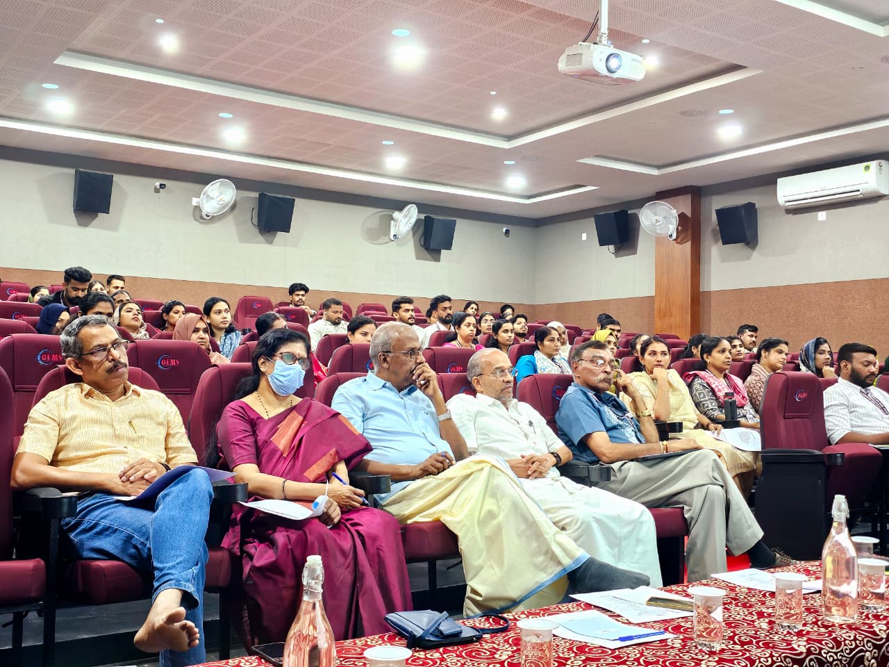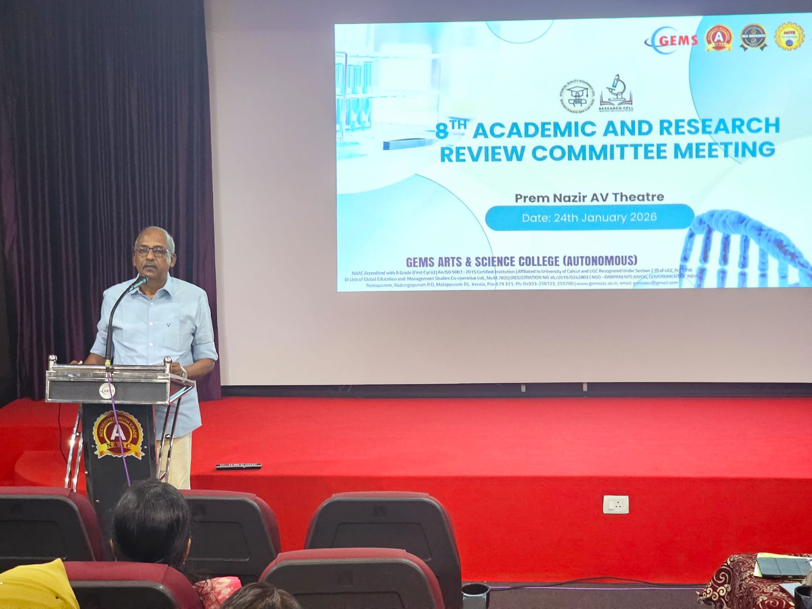 meeting due to unavoidable reasons. The experts were satisfied with the progress that the institution has made during the assessment period. Dr.Hameed appreciated faculties and management for following the recommendations of previous ARRC. He made observations such as conducting the International Expert’s Lecture Series, Nexus journal, achievements in patents and had a great appreciation when compared to other institutions. Dr. Hameed appreciated the institution’s initiative in introducing seed money grants to promote research among faculty members. Additionally, he commended the college for obtaining SWAYAM Local Chapter status and recommended ensuring complete registration of students in SWAYAM/MOOC courses. Dr. Suseela appreciated Research and Academic Director for his achievement from his former position in the University. She appreciated the seed money grant provided by the management to carry out research work . Dr. B. G. Unni, Academic and Research Director, reviewed the proceedings of the meeting and emphasized the importance of strengthening research activities within the institution. Shri P. T. Hamsa, Director, GEMS Arts and Science College, felicitated the gathering and appreciated the progress of the college at all levels. Shri Vasudevan M, Vice Chairman, Vice Chairman, felicitated the gathering and delivered the concluding remarks of the meeting. He spoke about the recently inaugurated Centre for Applied Artificial Intelligence and Semiconductor Laboratory, and outlined plans to integrate Artificial Intelligence into the curriculum for the upcoming academic year 2026–2027..As an initial step, the management proposed organizing training programmes in AI for faculty members. He also pointed out that the existing Memoranda of Understanding (MoUs) were not fully functional and emphasized the need to activate and effectively utilize them. Additionally, he stressed the importance of strengthening the research ecosystem through increased research publications. He further highlighted the role of mentoring in shaping the character and behaviour of students, thereby fostering a vibrant academic community. The meeting concluded with a vote of thanks delivered by Dr. Nayana P, Research Officer, GEMS Arts and Science College