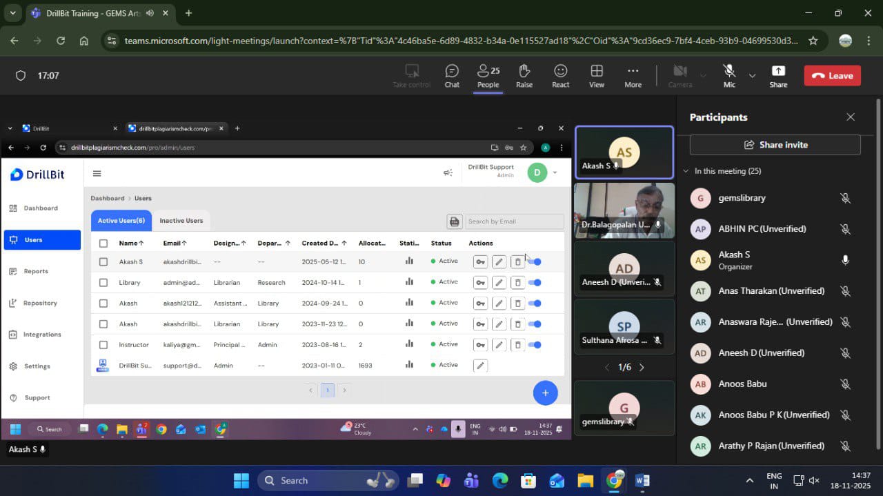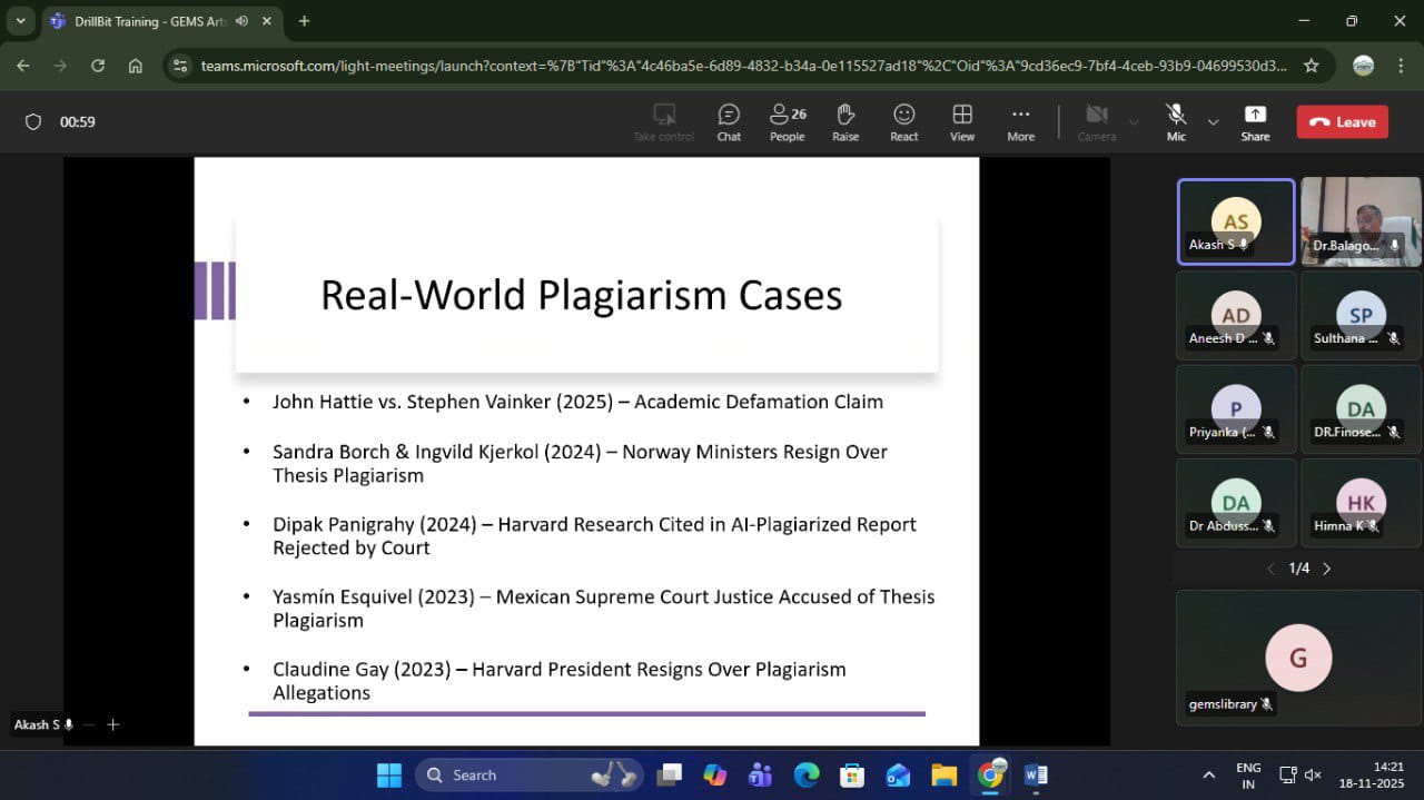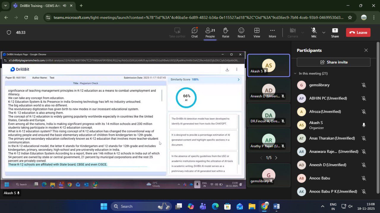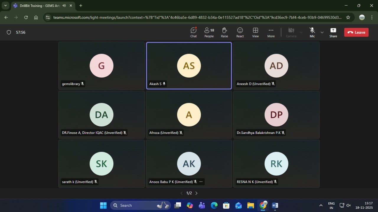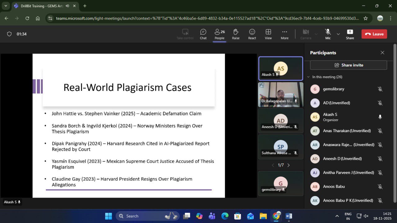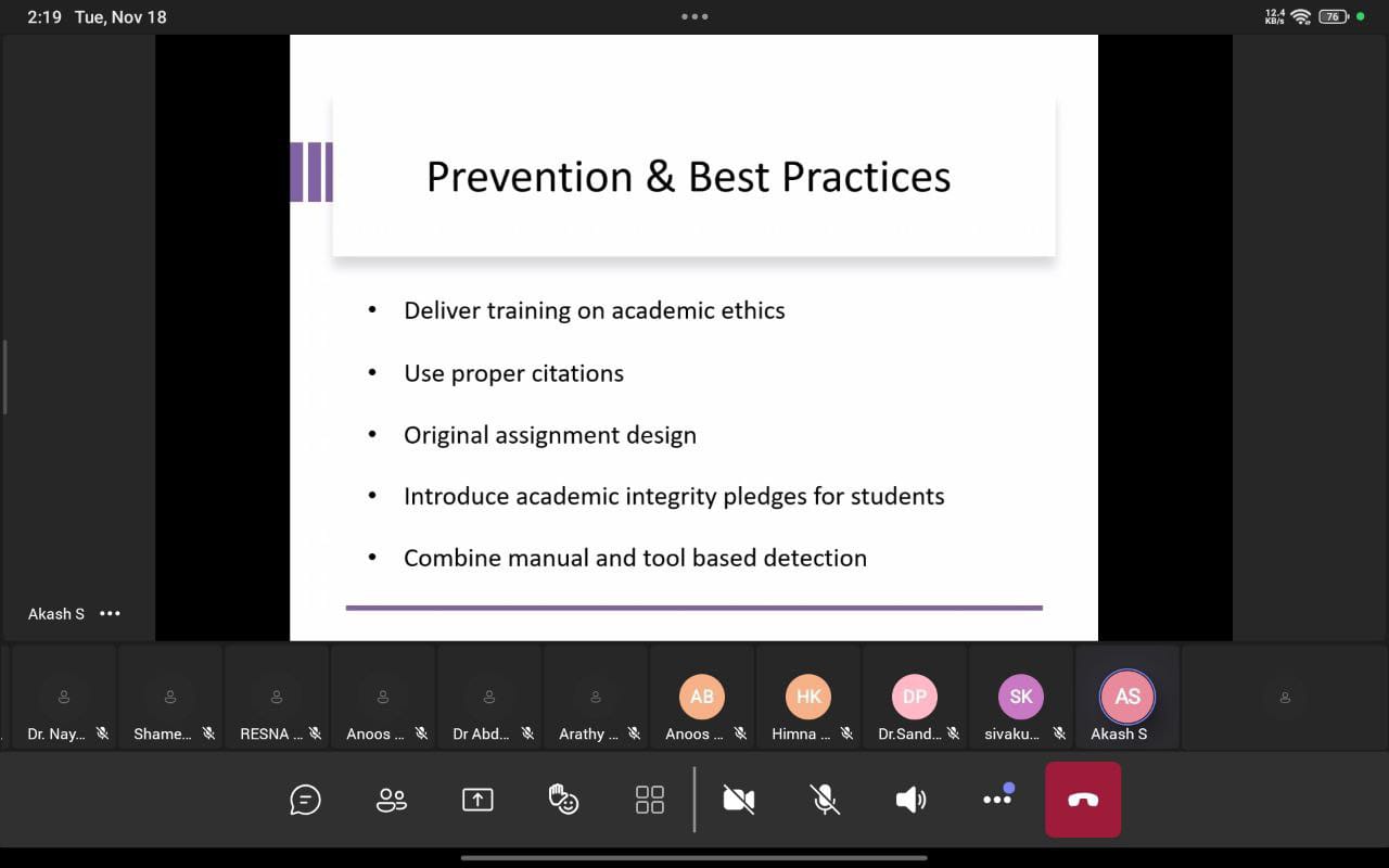 GEMS Publication Committee of GEMS Arts and Science College (Autonomous), along with IQAC, conducted an online awareness session on Drillbit Plagiarism Checking Software on 18th November 2025 from 2:00 PM to 3:00 PM through Microsoft Teams to promote awareness on preventing plagiarism and encouraging honest research among teachers and students. Mr. Aneesh D., Assistant Librarian, welcomed all, followed by the inaugural address from Dr. B.G. Unni, Academic and Research Director, who stressed the importance of academic integrity. Ms. Sulthana Afrosa P.P., Head of the English Department, introduced the resource person, Mr. Akash S., Assistant Manager from Drillbit, who demonstrated the software, its features, and how to check documents and read similarity reports. The session ended with a vote of thanks by Dr. Sandhya Balakrishnan P.K., Head of the Computer Applications Department. The session was very useful, helping participants understand plagiarism rules and learn how to detect plagiarism using the Drillbit software.