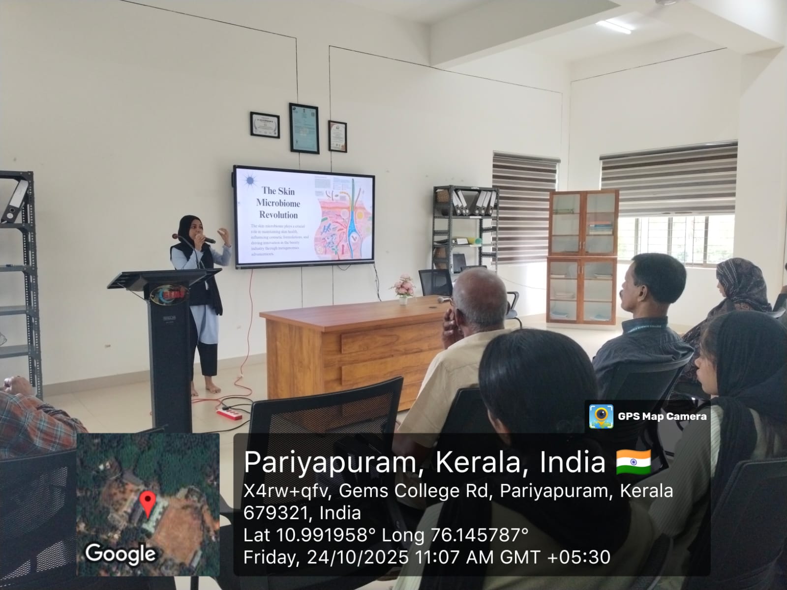 The first presentation was delivered by Ms. Haneena M, S3 MSc Biotechnology, from the PG Department of General Biotechnology. Her talk, titled “Unveiling the Skin Microbiome for Cosmetic Applications through Metagenomics,” focused on the role of skin microbiota in cosmetic science and the application of metagenomic approaches to study microbial diversity.