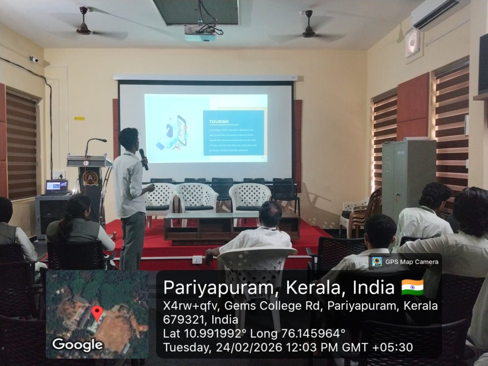 The Student Seminar Series, organized by the Research and Innovation Centre in association with the Internal Quality Assurance Cell (IQAC), was successfully conducted on Tuesday, 24th February 2026, at 12:00 PM in the MP Narayanamenon Hall. The seminar featured a student presentation by Mr. Akash Peethambaran, S4 BTTM , from the Department of Travel & Tourism. He delivered an informative talk on the topic “Future Trends in Tourism” The presentation highlighted the emerging developments in the tourism sector including the impact of digital transformations, and evolving traveler preferences.