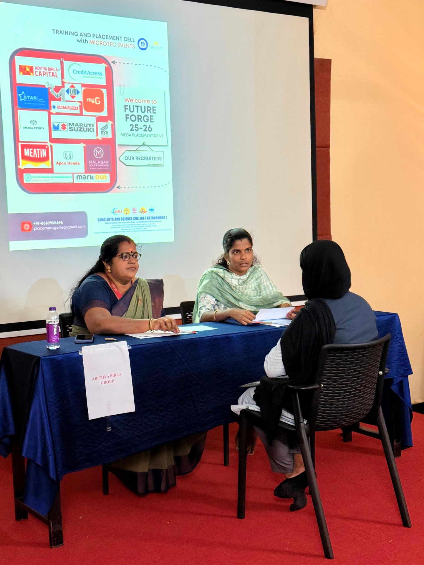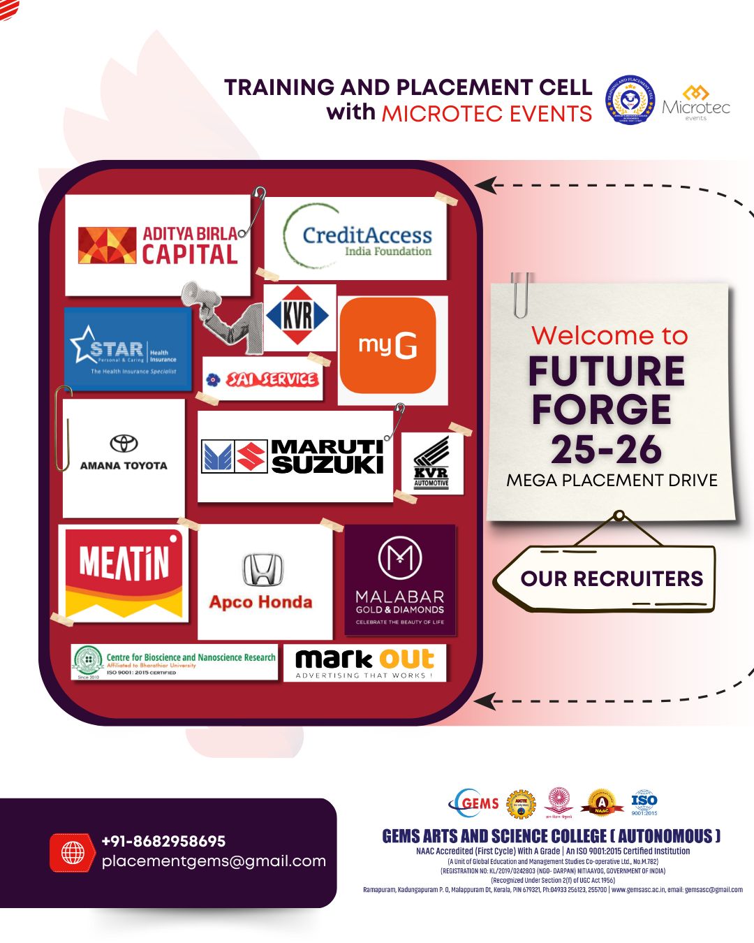 The Training and Placement cell in association with Microtec Events, organized the Future Forge 25–26 Mega Placement Drive on 15 December 2025 at 10am to 3.30pm. The program was designed to provide a strong employment platform for final-year students, alumni, and eligible local community members, while strengthening industry–institution collaboration. More than 15 reputed companies participated, offering placement opportunities to final-year students, alumni, and eligible local community members. The drive included registrations, one-on-one interviews, and HR interactions.