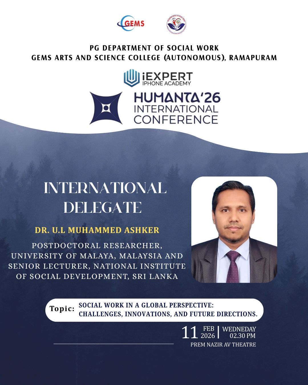 The PG Department of Social Work, GEMS Arts and Science College (Autonomous), is organizing HUMANTA 26, an International Conference on the theme “Transforming Social Work: Addressing Emerging Needs, Scope, and Challenges”, on 11th February 2026 at the Prem Nazir Audio-Visual Theatre and Research Centre.