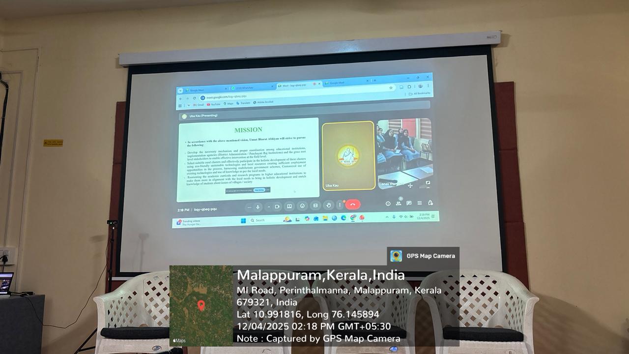 The UBA Cell in association with IQAC organized an Orientation Program on Unnat Bharat Abhiyan (UBA) on 4 December 2025 at M.P. Narayana Menon Hall, GEMS Arts and Science College (Autonomous), Malappuram. The session was attended by 47 students from the MSW and Sociology departments. The program was inaugurated by Dr. Naveen Mohan, Principal, followed by remarks from Dr. Abdul Samad, Vice Principal, and Dr. Finose A, IQAC Director. The welcome address and coordination were handled by Anas Tharakan, UBA Coordinator. The resource person, Shri. Akhil GS, Project Coordinator (RCI), Kerala Agricultural University joined to the program online and delivered an insightful orientation on the objectives, components, and implementation strategies of UBA, focusing on village adoption, community engagement, and student participation in rural development initiatives.