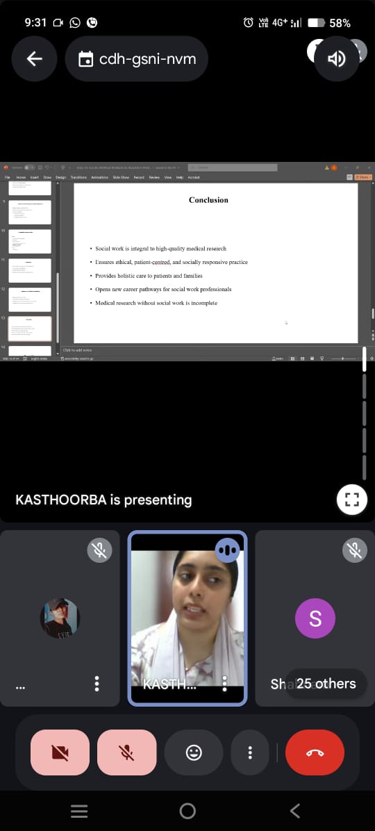 PG Department of Social Work conducted, the Alumni Lecture Series 11successfully via Google Meet on 29th December 2025. The topic, “Role of Social Worker in Medical Projects,” was expertly handled by Kasthoorba K, Project Technical Support at Amrita Hospital, Kochi.