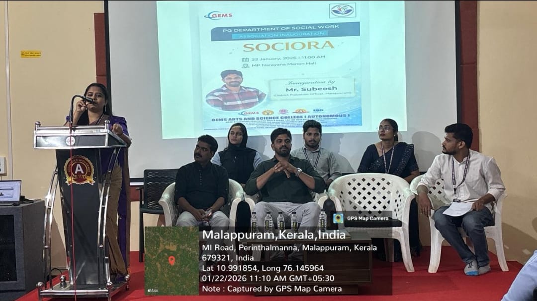 The PG Department of Social Work, GEMS Arts and Science College (Autonomous), successfully organized the Association Inauguration Ceremony of “SOCIORA” on 22 January 2026 at 11:00 AM in the MP Narayana Menon Hall. The programme commenced with a welcome speech by Ms. Anitha Parveen J, who warmly welcomed the dignitaries, faculty members, and students, and highlighted the relevance of the association in promoting academic excellence, leadership, and professional competence among social work students.