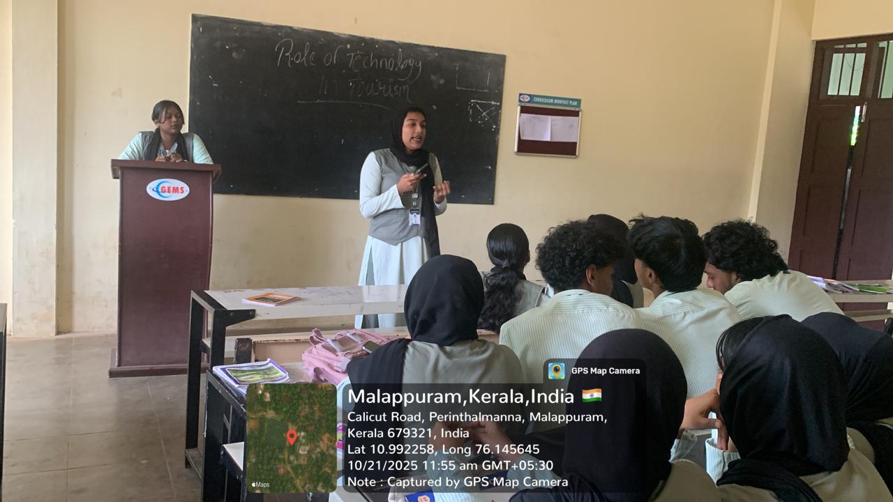 The peer teaching session was handled by Fathima Nidha T and Ansila P, students of 3RD Semester BTTM, on the topic “Advanced Technologies in the Tourism Industry.” The objective of the session was to enhance collaborative learning and to promote student-led knowledge sharing on emerging trends in tourism.