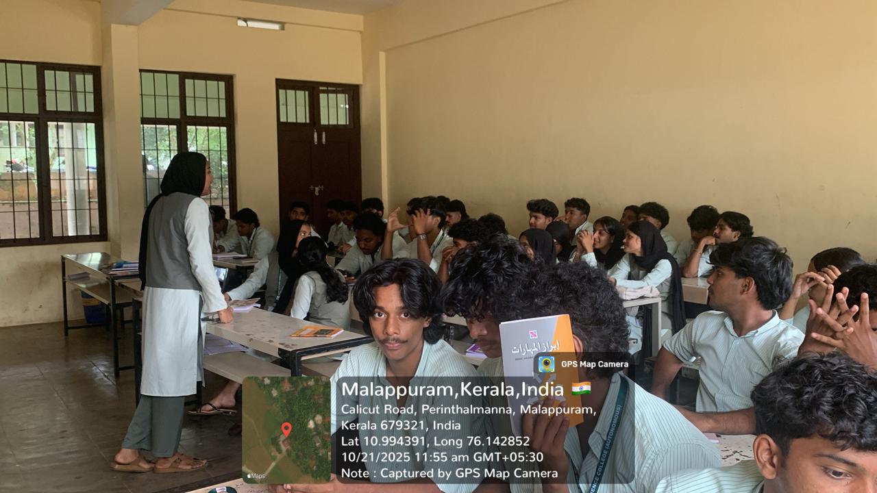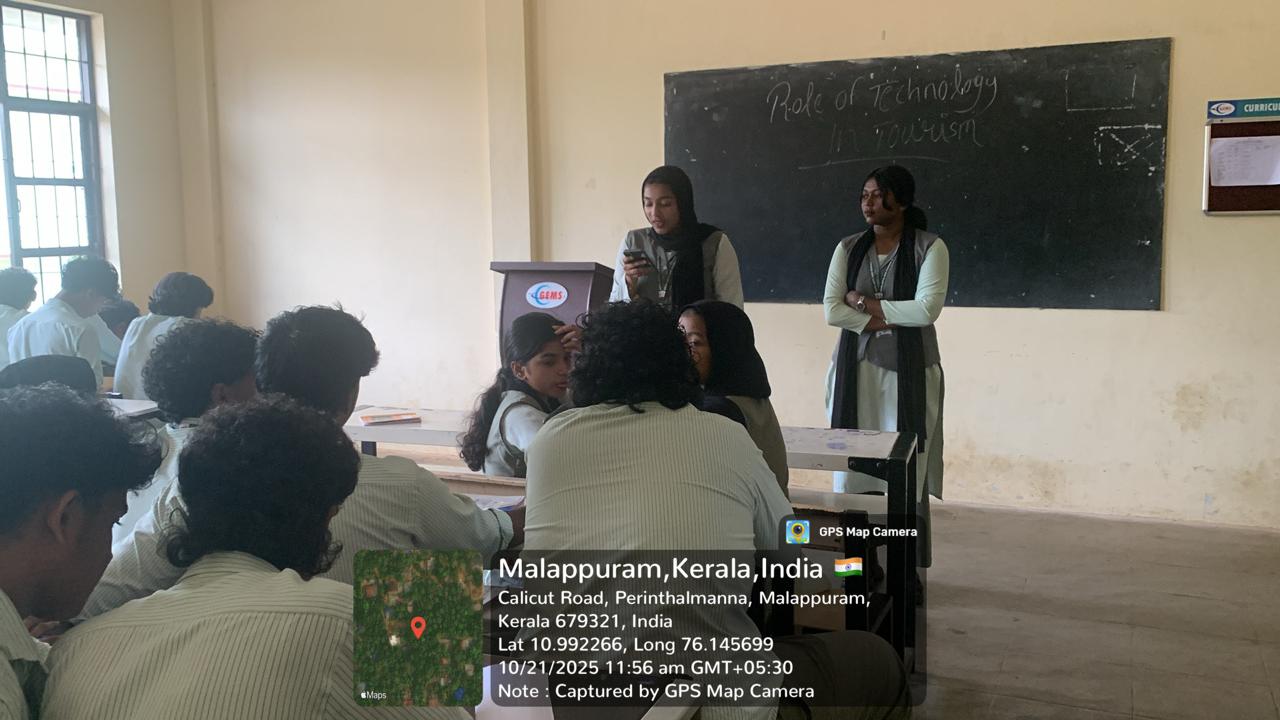 The peer teaching session was handled by Fathima Nidha T and Ansila P, students of 3RD Semester BTTM, on the topic “Advanced Technologies in the Tourism Industry.” The objective of the session was to enhance collaborative learning and to promote student-led knowledge sharing on emerging trends in tourism.
