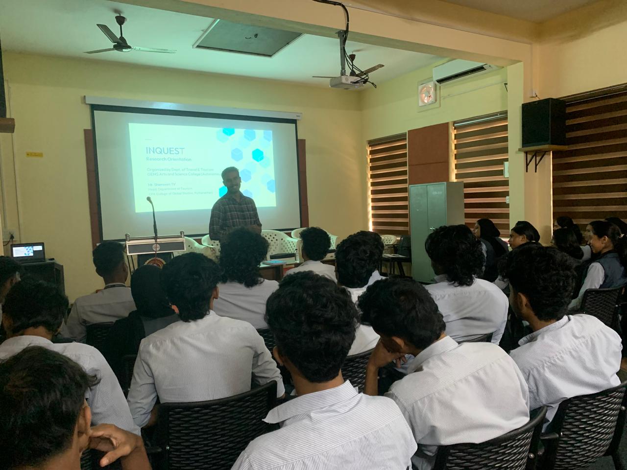 The Department of Travel and Tourism Management, GEMS Arts and Science College (Autonomous), organized a research-oriented academic programme titled “Inquest: A Journey into the Logic of Research” on 21 December 2025. The programme was designed to provide students with a clear understanding of the fundamentals of research, its logical framework, and its relevance in academic and professional fields. The session was held at MPN Hall and commenced at 10:00 a.m. The resource person, Mr. Muhammed Abdul Shameem TV, delivered an insightful and engaging talk on the concept of research, emphasizing the importance of logical thinking, problem identification, research design, and methodology. He explained various stages of research in a simple and practical manner, making it easy for students to grasp complex ideas. The speaker also highlighted the relevance of research in tourism studies, particularly in understanding industry trends, consumer behaviour, and sustainable development. Real-life examples and experiences were shared to motivate students to develop research aptitude and critical thinking skills. The programme witnessed active participation from students of the Department of Travel and Tourism Management. An interactive session followed the lecture, during which students raised questions related to project work, data collection methods, and career opportunities in research. The resource person addressed all queries patiently and provided valuable guidance. The programme successfully enhanced students’ understanding of the logic and importance of research. It encouraged students to approach academic projects systematically and analytically. The session also motivated students to pursue research-oriented thinking in their future academic and professional endeavours. The Department expresses its sincere gratitude to the resource person for sharing his expertise and to all participants for making the programme a success.