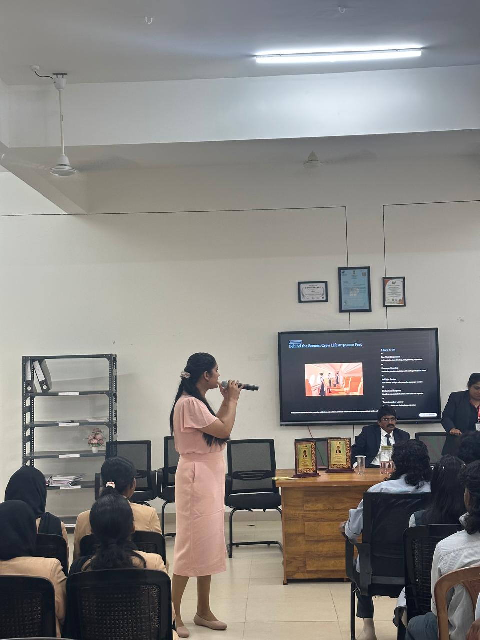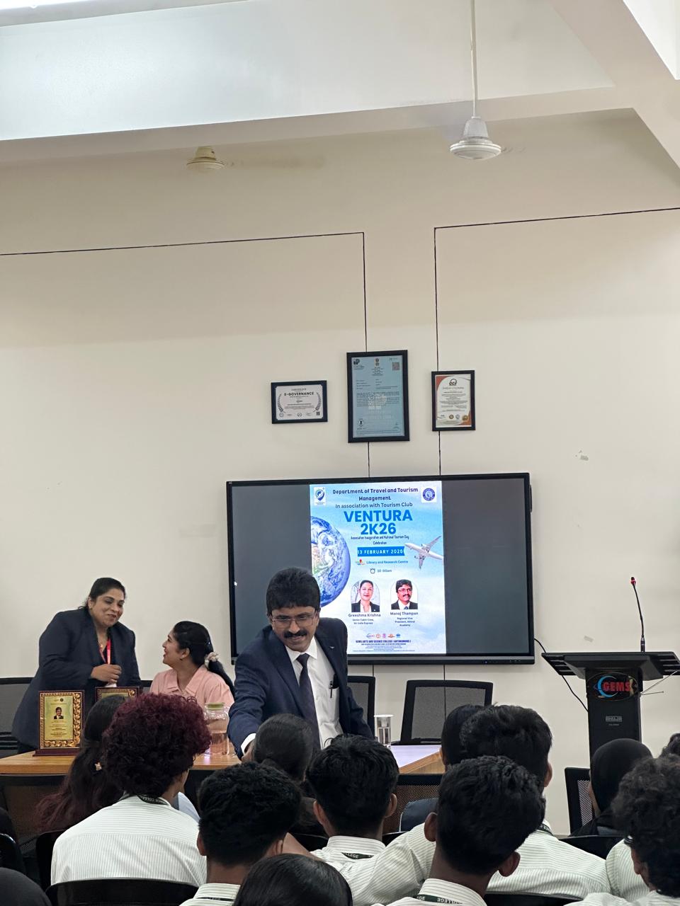 The Department of Travel and Tourism Management, in association with the Tourism Club, organized VENTURA 2K26 – Association Inauguration and National Tourism Day Celebration on 13 February 2026 at 10:00 AM in the Library and Research Centre of GEMS Arts and Science College (Autonomous). The programme was conducted with the objective of inaugurating the department association and celebrating National Tourism Day. The programme commenced with a welcome speech delivered by Ms. Anju K P, Assistant Professor, Department of Travel and Tourism Management. She welcomed the dignitaries, faculty members, and students of BTTM, and highlighted the importance of organizing such academic and industry-oriented programmes. The Presidential Address was delivered by Ms. Arathy P Rajan, Head of the Department of Travel and Tourism Management, who emphasized the importance of professional competence, skill development, and dedication in building a successful career in tourism and aviation sectors. The function was further enriched by felicitations delivered by the Vice Principal, Mr. Sandeepan (Head of the Department of BBA), Mr. Rihas (Faculty, PG Department of English), and Mr. Jeevesh (Faculty, Language Department). They appreciated the efforts of the department in organizing the programme and encouraged students to make use of such opportunities for academic and professional growth. The official inauguration was carried out by the esteemed chief guests, Ms. Greeshma Krishna, Senior Cabin Crew, Air India Express, and Mr. Manoj Thampan, Regional Vice President, Alhind Academy. In their inaugural addresses, they shared valuable insights from their professional experiences and motivated students to develop communication skills, confidence, and industry readiness to excel in the competitive tourism and aviation industries. Following the inaugural session, a prize distribution ceremony was conducted to honor the University Examination Rank Holders. Students who secured first, second, and third positions from each batch (first year, second year, and third year BTTM) were awarded and appreciated for their academic excellence. The programme continued with informative sessions by both chief guests. Ms. Greeshma Krishna delivered an engaging session on career opportunities in aviation, responsibilities of cabin crew, safety standards, and the importance of customer service and professional grooming. Mr. Manoj Thampan conducted an insightful session on emerging trends in the travel and tourism industry, industry expectations, skill enhancement, and career pathways. The sessions were interactive and highly beneficial for the students. The formal session concluded with a vote of thanks. In the afternoon, a film screening session was organized at the Prem Nazir Audio Visual Theatre.